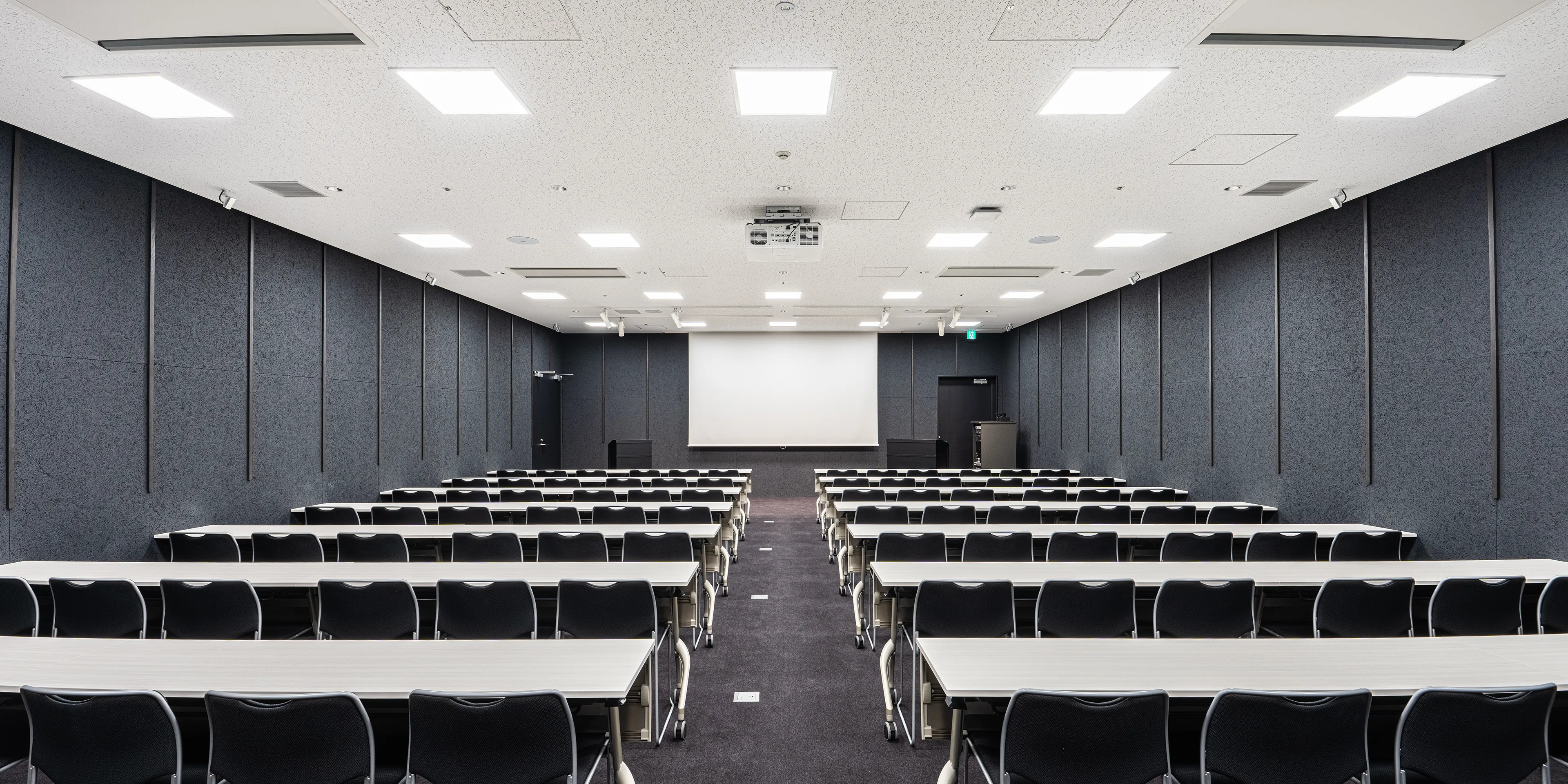 150インチスクリーン、演台・司会台、スポットライトなどの無料備品も充実しており、中規模のセミナー会場として最適です。