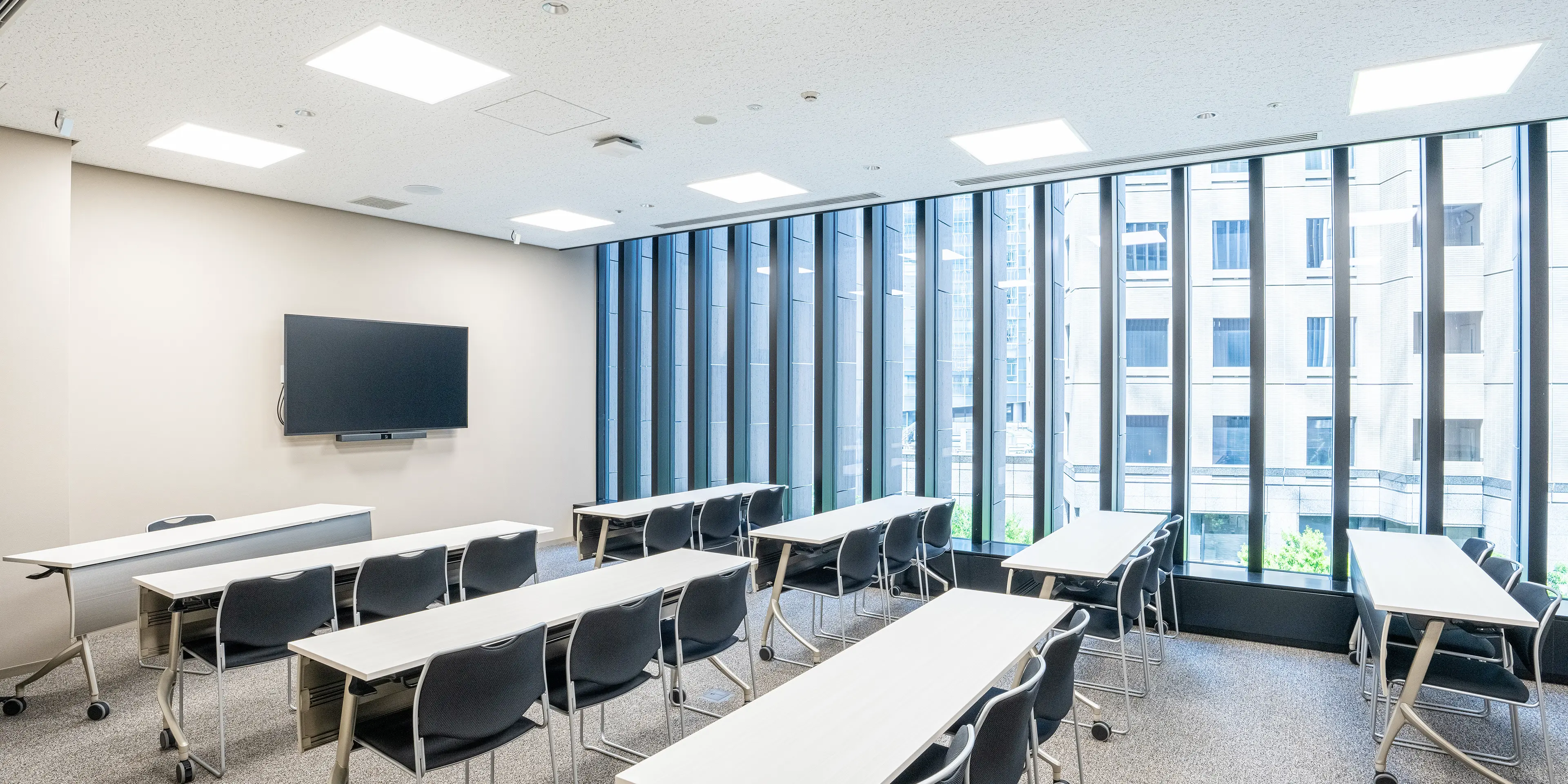 大きな窓に面した、明るく、採光のあるお部屋です。20名程度のご利用に適しており、研修や会議に適しています。